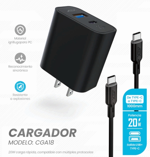 The 2-port charger offers outputs of 20W from USB-C and 18W from USB-A, with a total output of 15W when both ports are used. Includes a 1-meter Type-C cable and supports input of 100-240V.