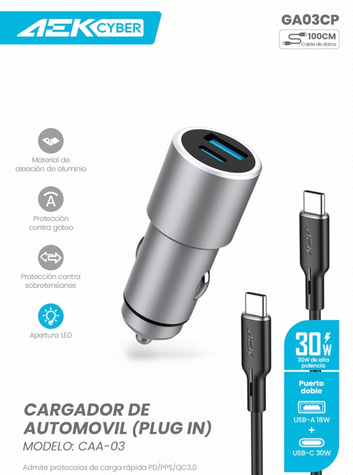 48W car charger with PD 30W + QC3.0 18W ports. Aluminum/steel construction with smart protection for simultaneous fast charging. Includes Type-C cable.