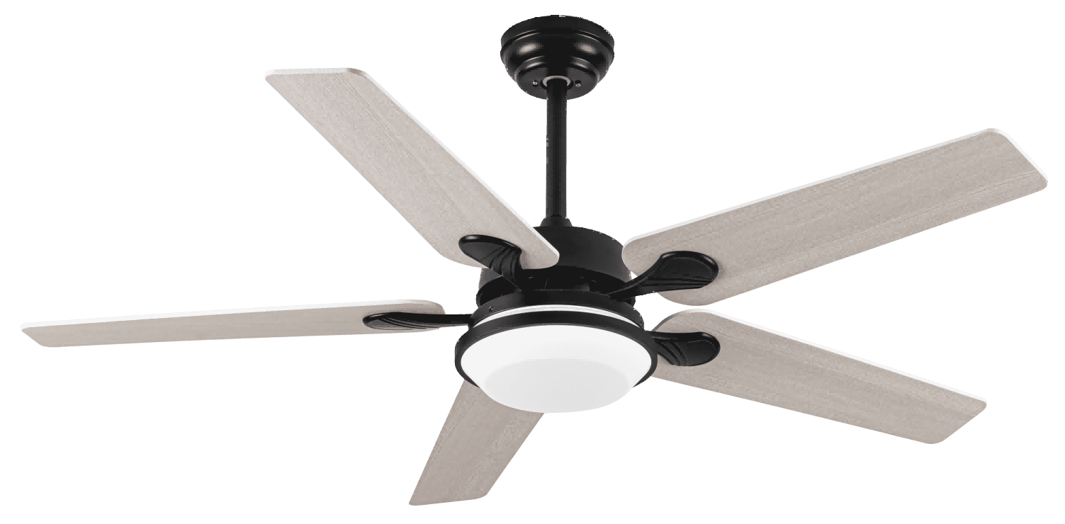 Lámpara ventilador de 3 aspas rectas de 52 pulgadas, 205 revoluciones por minuto y un flujo de aire de 154 m³/minuto.