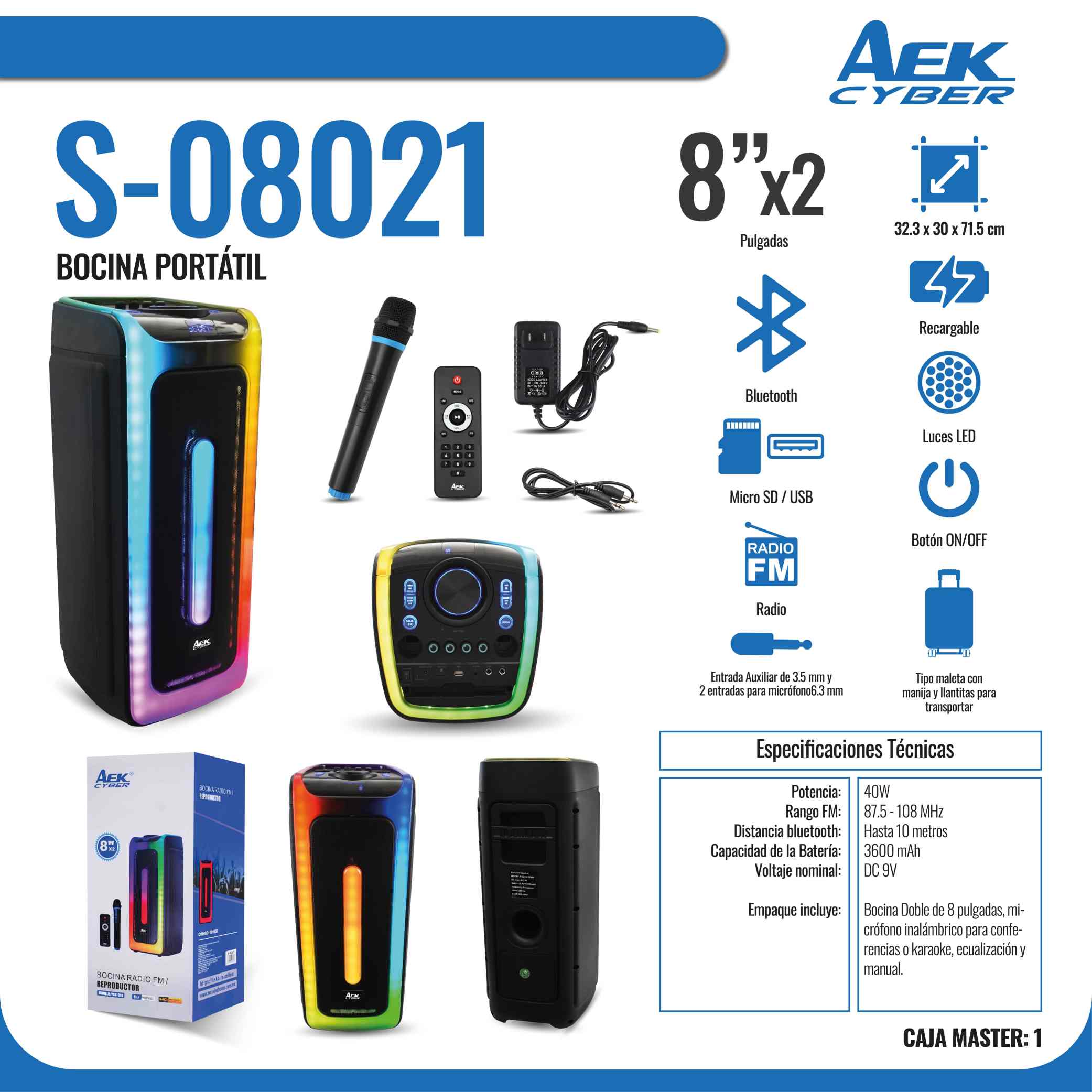 con luces LED y micrófono de cable, compatible con modos USB/TF/FM/AUX, adecuado para fiestas en caravanas, campings y karaoke al aire libre.