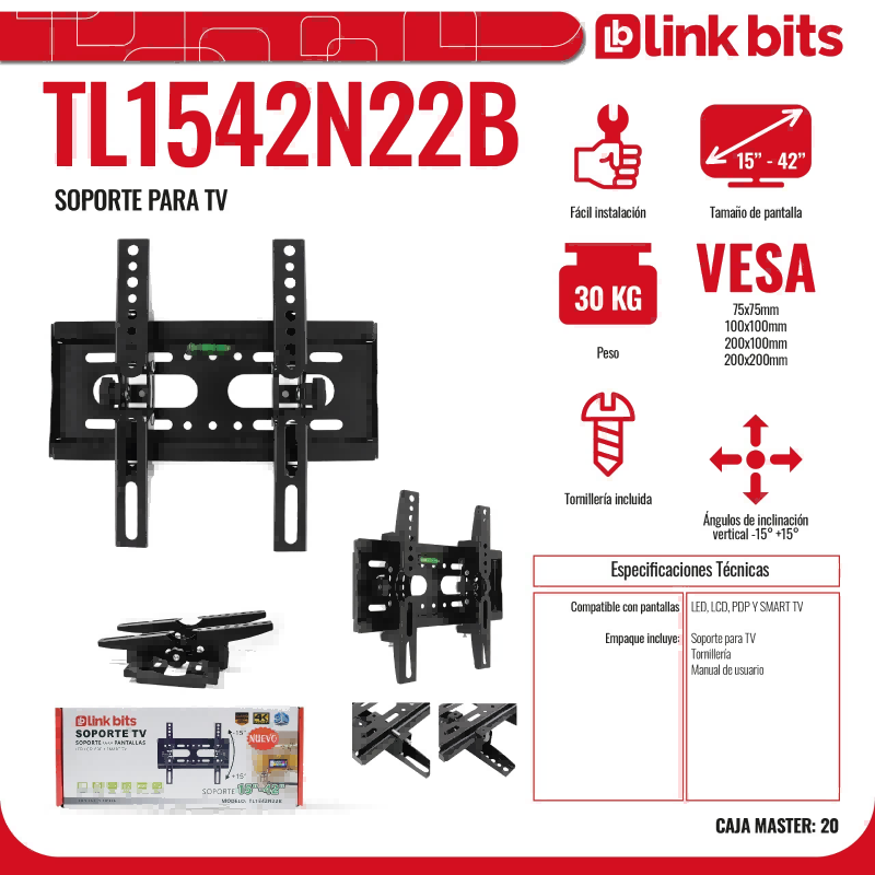 Diseñado para pantallas de 15-42 pulgadas y fabricado en acero al bajo carbón, tiene excelente resistencia para soportar un peso de hasta 25 kg.Incluye todos los tornillos y herrajes necesarios para armarlo y fijarlo en la pared; además de un práctico nivel que te ayudará a colocarlo en la posición perfecta.