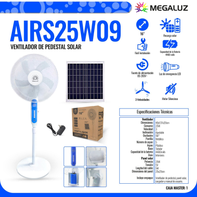 Ventilador con protector de red metálico, regulación de velocidad en tres挡, equipado con panel solar de 25W, batería integrada de gran capacidad de 4400mAh, fácil de usar, y también incluye cable de alimentación para conexión a la red eléctrica.