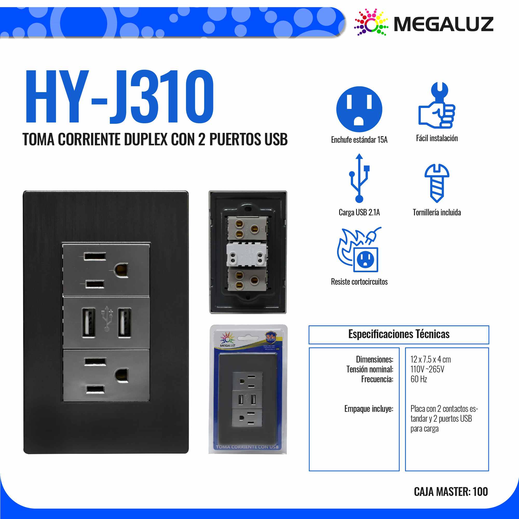 Dos enchufes de tres polos estándar estadounidense + dos enchufes USB (doble puerto A)