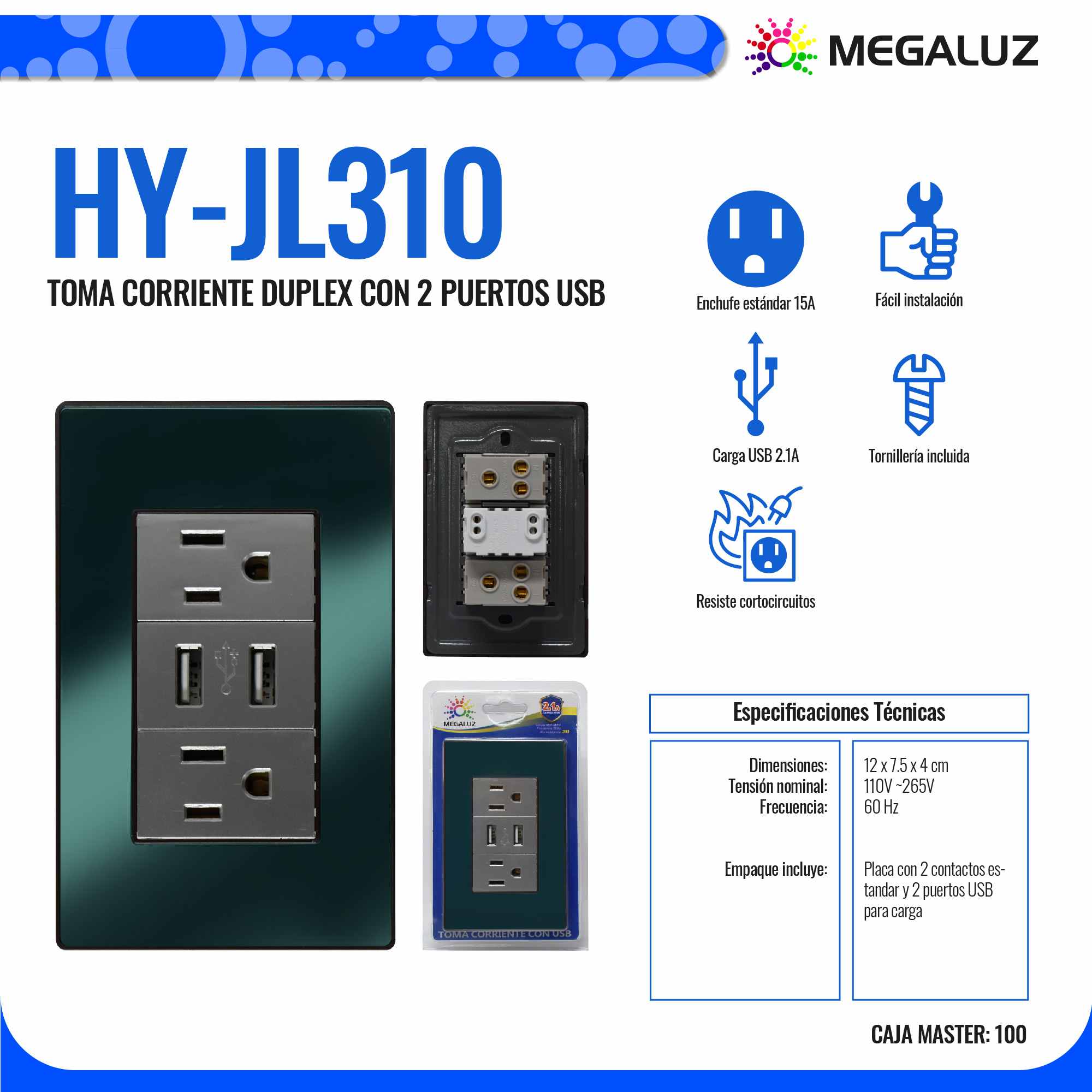 Dos enchufes de tres polos estándar estadounidense + dos enchufes USB (doble puerto A)