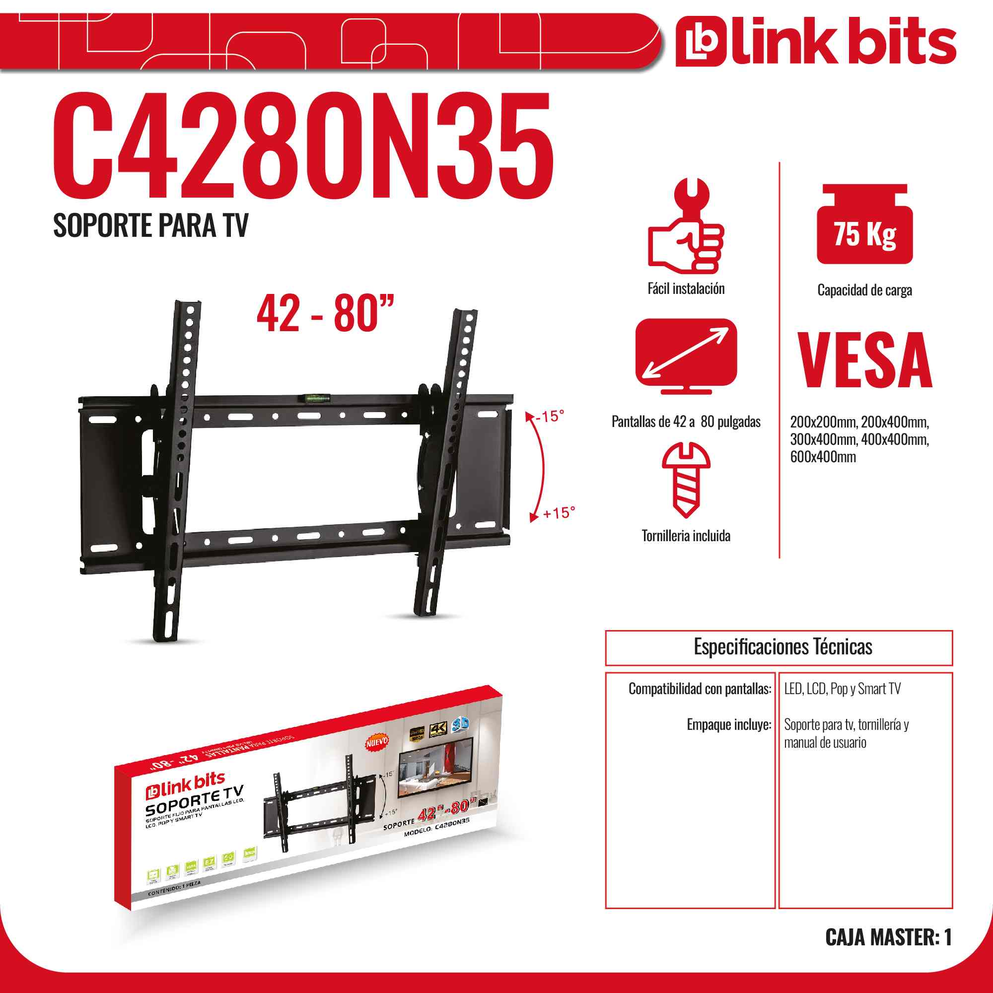Diseñado para pantallas de 42-80 pulgadas y fabricado en acero al bajo carbón, tiene excelente resistencia para soportar un peso de hasta 75 kg.Incluye todos los tornillos y herrajes necesarios para armarlo y fijarlo en la pared; además de un práctico nivel que te ayudará a colocarlo en la posición perfecta.