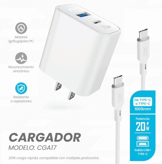 The 2-port charger offers outputs of 20W from USB-C and 18W from USB-A, with a total output of 15W when both ports are used. Includes a 1-meter Type-C cable and supports input of 100-240V.