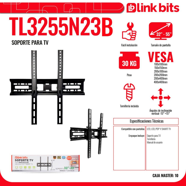 Diseñado para pantallas de 32-55 pulgadas y fabricado en acero al bajo carbón, tiene excelente resistencia para soportar un peso de hasta 25 kg.Incluye todos los tornillos y herrajes necesarios para armarlo y fijarlo en la pared; además de un práctico nivel que te ayudará a colocarlo en la posición perfecta.