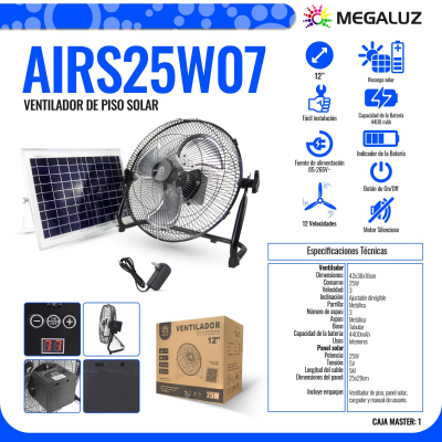 Ventilador con protector de red metálico, regulación de velocidad en tres挡, equipado con panel solar de 25W, batería integrada de gran capacidad de 4400mAh, fácil de usar, y también incluye cable de alimentación para conexión a la red eléctrica.